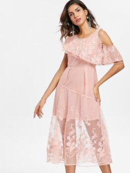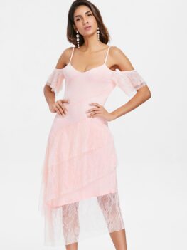 Product Description: This sweet dress features the bare shoulder layout with slender straps and ruffles sleeve, layered bottom with the chic falbala design, lace to cover all with a light pink lining, and midi length. It's suited for a lot of occasions. Style: Brief Material: Lace,Polyester Occasion: Beach and Summer,Bridal,Bridesmaid,Cocktail & Party,Evening,Party,Semi Formal,Wedding Silhouette: Asymmetrical Dresses Length: Mid-Calf Neckline: Spaghetti…