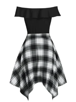 Elegant off-the-shoulder neckline adds dramatic punctuation to this midi dress which features a solid bodice with ruffled detail and sexy lace-up front. Plaid skirt features a flattering handkerchief hemline. High waist for extending your body proportions.   Style: Fashion Occasion: Cocktail & Party,Day Material: Polyester,Polyurethane Silhouette: Asymmetrical Dresses Length: Mid-Calf Neckline: Off The Shoulder Sleeve Length: Short Sleeves Embellishment: Lace up Pattern Type: Plaid…