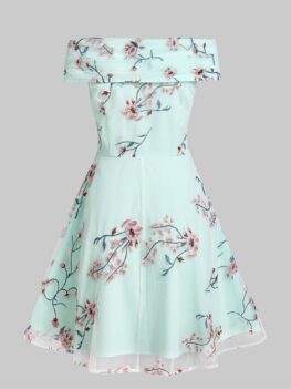 • Flower Embroidered Off The Shoulder Skater Dress