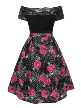 This Halloween dress has a lace overlay top part and spider wed print skirt part. The off-shoulder helps to show off your luscious shoulder, and the roses pattern hints your feminine side.   Style: Fashion Occasion: Cocktail & Party,Prom Material: Polyester Silhouette: A-Line Dresses Length: Knee-Length Neckline: Off The Shoulder Sleeve Length: Short Sleeves Embellishment: Lace Pattern Type: Floral With Belt: No Season: Fall