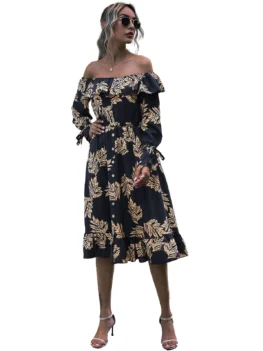 Style: Fashion Occasion: Casual ,Day,Vacation Material: Cotton,Polyester Silhouette: A-Line Dresses Length: Knee-Length Neckline: Off The Shoulder Sleeve Type: Poet Sleeve Sleeve Length: Long Sleeves Embellishment: Flounce Pattern Type: Leaf With Belt: No Season: Fall,Spring Weight: 0.3350kg Package Contents: 1 x Dress