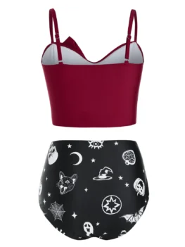 Perfectly mix and match to create various beach looks with your favorite pieces, this contrast tankini is fashioned with a knotted top with adjustable shoulder straps and a high waisted bottom designed with ruches and covered in skulls, stars, etc. to accent the Halloween vibes.   Style: Fashion Swimwear Type: Tankini Gender: For Women Material: Polyester,Polyurethane Bra Style: Padded Support…