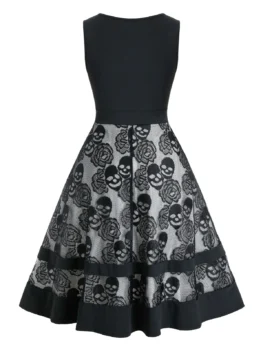Style: Casual Material: Polyester,Polyurethane Silhouette: A-Line Dresses Length: Knee-Length Neckline: V-Neck Sleeve Length: Sleeveless Waist: High Waisted Embellishment: Lace Pattern Type: Skull Elasticity: Elastic With Belt: No Season: Fall,Spring Weight: 0.5120kg Package Contents: 1 x Dress