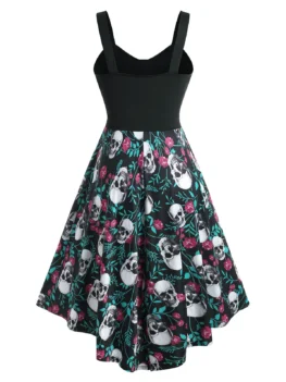 • Plus Size Skull Rose Print Halloween Fit and Flare Dress