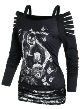Style: Gothic Material: Polyester,Polyurethane Collar: Square Neck Shirt Length: Long Sleeve Length: Full Pattern Type: Skull Embellishment: Lace,Ripped Season: Fall,Spring Elasticity: Elastic Weight: 0.2270kg Package Contents: 1 x Top