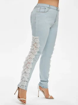 Style: Fashion Length: Normal Material: Cotton,Polyester,Polyurethane,Viscose Fabric Type: Denim Fit Type: Skinny Waist Type: High Closure Type: Zipper Fly Pattern Type: Others Embellishment: Lace Pant Style: Pencil Pants Wash: Bleach Wash Elasticity: Elastic Package Contents: 1 x Jeans Weight: 0.6000kg