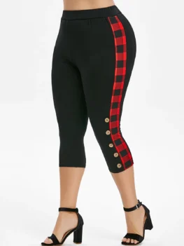 The high waist design makes this pair of cropped leggings look more fashionable! Soft, sleek fabric and plaid added appeal. Elasticized waistband. Style: Fashion Length: Capri Material: Polyester Fit Type: Skinny Waist Type: High Closure Type: Elastic Waist Pattern Type: Plaid Embellishment: Button Pant Style: Skinny Elasticity: Elastic Weight: 0.3100kg