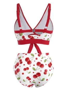 Covered in a sweet cherry pattern, the two-piece comprises a pair of high-rise briefs and a coordinating crop top with a surplice V-neckline and cutout knot detail on the front for maximum tanning potential.   Style: Fashion Swimwear Type: Bikini Gender: For Women Material: Polyamide,Polyester,Polyurethane Bra Style: Padded Support Type: Wire Free Neckline: V Neck Pattern Type: Cherry Embellishment: Cut Out,Tie Waist: High Waisted Elasticity: Elastic