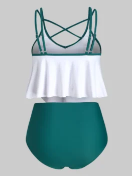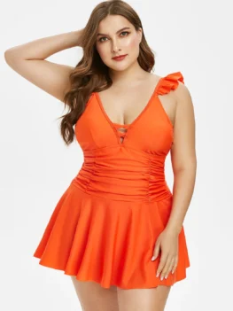 Flaunt your figure with this enchanting skirted tankini swimwear which features a low cut neckline that has crisscross detail to enhance the flirty vibe. The ruched design helps to provide a sleek look, while the back is fully open to create a sexy charming look. The ruffles decorate on the shoulder straps offer a sweet…