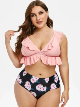 • Plus Size Plunge Floral Print Ruffled Tankini Swimwear