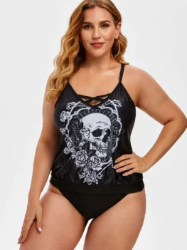 • Plus Size Skull Print Cinched Blouson Tankini Swimwear
