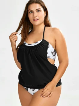 • Prined Flounce Ruched Plus Size Tankini Swimsuit