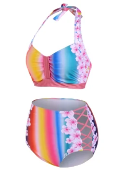 Style: Fashion Swimwear Type: Bikini Gender: For Women Material: Polyester,Polyurethane Bra Style: Padded Support Type: Wire Free Neckline: Halter Pattern Type: Floral,Rainbow Embellishment: Criss-Cross Waist: High Waisted Season: Summer Weight: 0.2400kg Package Contents: 1 x Bra 1 x Briefs