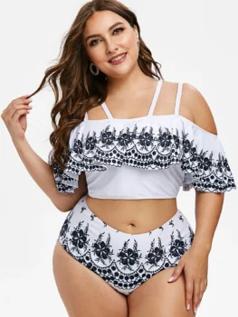 Printed Strappy Flounces Cold Shoulder Plus Size Two Piece Swimw