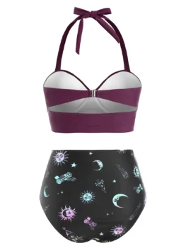 Contrast design makes it easy to grab the eyes of this tankini featuring a halter top with supportive underwires and the bottom is designed with astrology sun stars print and shaped to a high-rise fit with ruching for extra abdomen support.   Style: Fashion Swimwear Type: Tankini Gender: For Women Material: Nylon,Polyester,Spandex Bra Style: Push Up Support Type: Underwire Neckline: Halter Pattern…