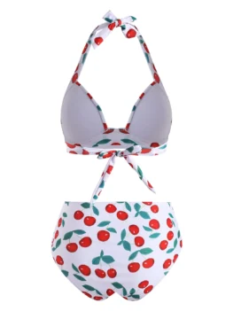 Style: Fashion Swimwear Type: Bikini Gender: For Women Material: Polyester,Spandex Bra Style: Padded Support Type: Wire Free Neckline: Halter Pattern Type: Cherry Embellishment: Ruched,Tie Waist: High Waisted Elasticity: Elastic Season: Summer Weight: 0.2050kg Package Contents: 1 x Bra 1 x Briefs