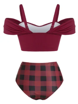 Cold Shoulder Plaid Print High Waisted Tankini Swimwear