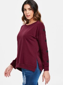 This trendy sweatshirt in solid color emphasizes a crew neck, long split sleeves with modern button closures detail, and drop shoulder design, as well as an alluring side slit which add charm and fashion. Wear it with ripped skinny pants for a stylish street look. Material: Cotton,Polyester Shirt Length: Regular Sleeve Length: Full Style: Casual Pattern Style: Solid Embellishment: Button…