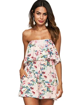Timeless tropical printing decorates a lightweight romper with an alluring strapless neckline and a fluttering ruffled overlay. Style: Fashion Material: Polyester,Polyurethane Pattern Type: Floral Fit Type: Regular Season: Summer With Belt: No Weight: 0.3000kg Package Contents: 1 x Romper