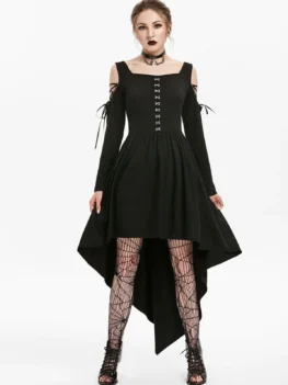 Style: Gothic Occasion: Day Material: Polyurethane,Rayon Silhouette: High Low Dresses Length: Floor-Length Neckline: Square Collar Sleeve Length: Long Sleeves Embellishment: Lace up Pattern Type: Solid With Belt: No Season: Fall,Spring Weight: 0.5000kg Package Contents: 1 x Dress