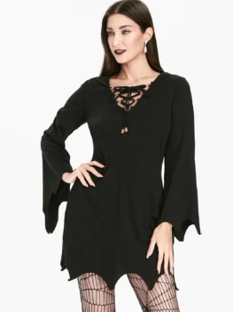 Style: Gothic Occasion: Casual ,Holiday Material: Polyester Silhouette: Asymmetrical Dresses Length: Mini Neckline: Hooded Sleeve Type: Flare Sleeve Sleeve Length: Long Sleeves Embellishment: Lace up Pattern Type: Solid With Belt: No Season: Fall Weight: 0.3500kg Package Contents: 1 x Dress