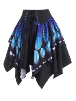 Printed with a butterfly pattern that echoes well with the hanky hem to show your vibrant side. And the lace-up design helps to highlight your slim waist. Material: Polyester Length: Knee-Length Skirt Type: Handkerchief Skirt Silhouette: A-Line Pattern Type: Galaxy Embellishment: Lace up Season: Fall,Spring,Summer With Belt: No Weight: 0.2850kg Package Contents: 1 x Skirt