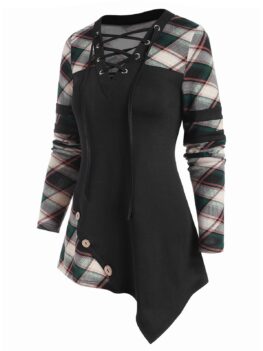 Style: Casual Material: Polyester Collar: V-Neck Shirt Length: Long Sleeve Length: Full Pattern Type: Plaid Embellishment: Button,Lace up Season: Fall,Spring Weight: 0.2870kg Package Contents: 1 x T-shirt