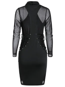 Rivet Embellished Mesh Insert Lace-up Gothic Bodycon Dress