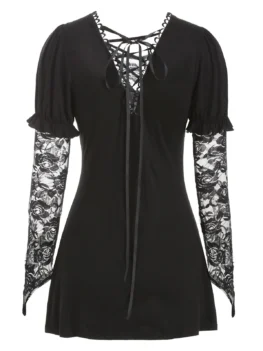 This curved hem tee is perfect for your Halloween night! Printed with spider web, skulls, butterfly and flower, it adorns with a sheer lace yoke and sleeves to show a bit of feminine vibe. Crisscross straps decorate the V-neck for a more inviting look. Style: Gothic Material: Polyester,Polyurethane Collar: V-Neck Shirt Length: Long Sleeve Length: Full Pattern Type: Butterfly,Skull Embellishment: Criss-Cross,Lace…