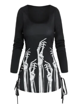 Style: Gothic Material: Polyester,Polyurethane Collar: Square Neck Shirt Length: Long Sleeve Length: Full Pattern Type: Skeleton Embellishment: Lace up Season: Fall,Spring Elasticity: Elastic Weight: 0.2400kg Package Contents: 1 x T Shirt