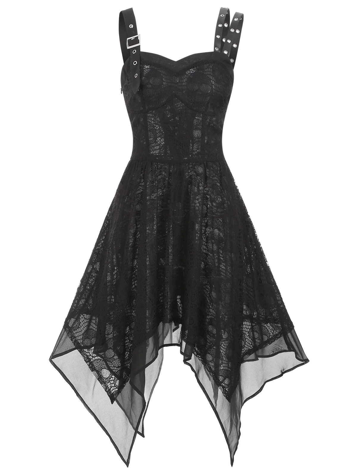 Asymmetrical Lace Buckle Grommet Strap Handkerchief Lace Up Dres