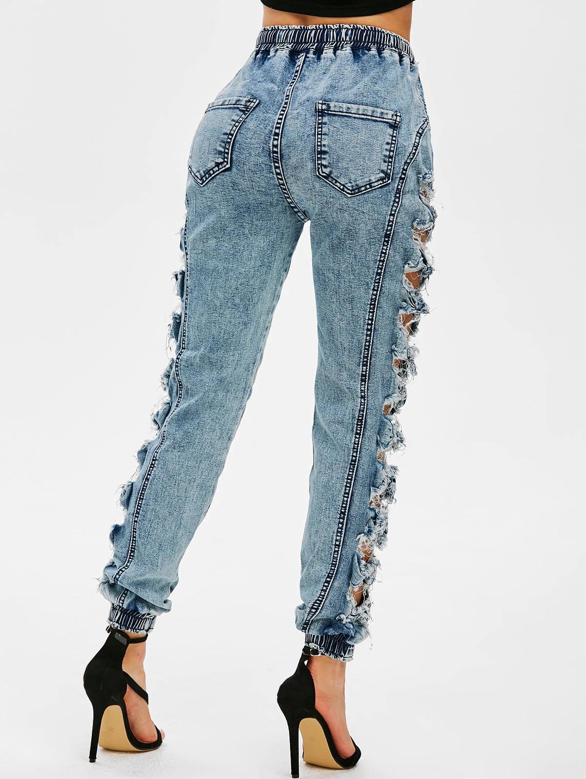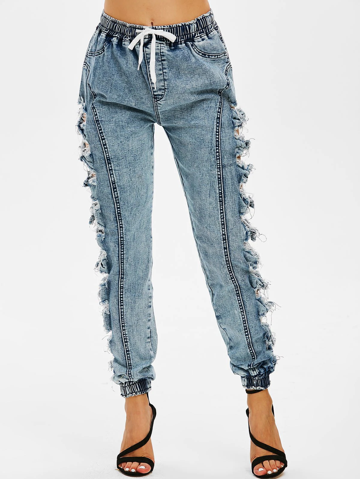 Bowknot Ripped Drawstring Elastic Hem Jeans