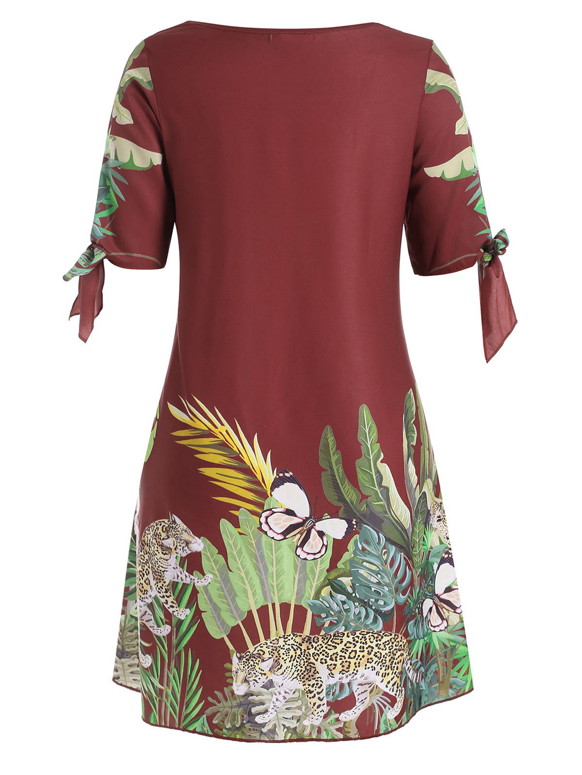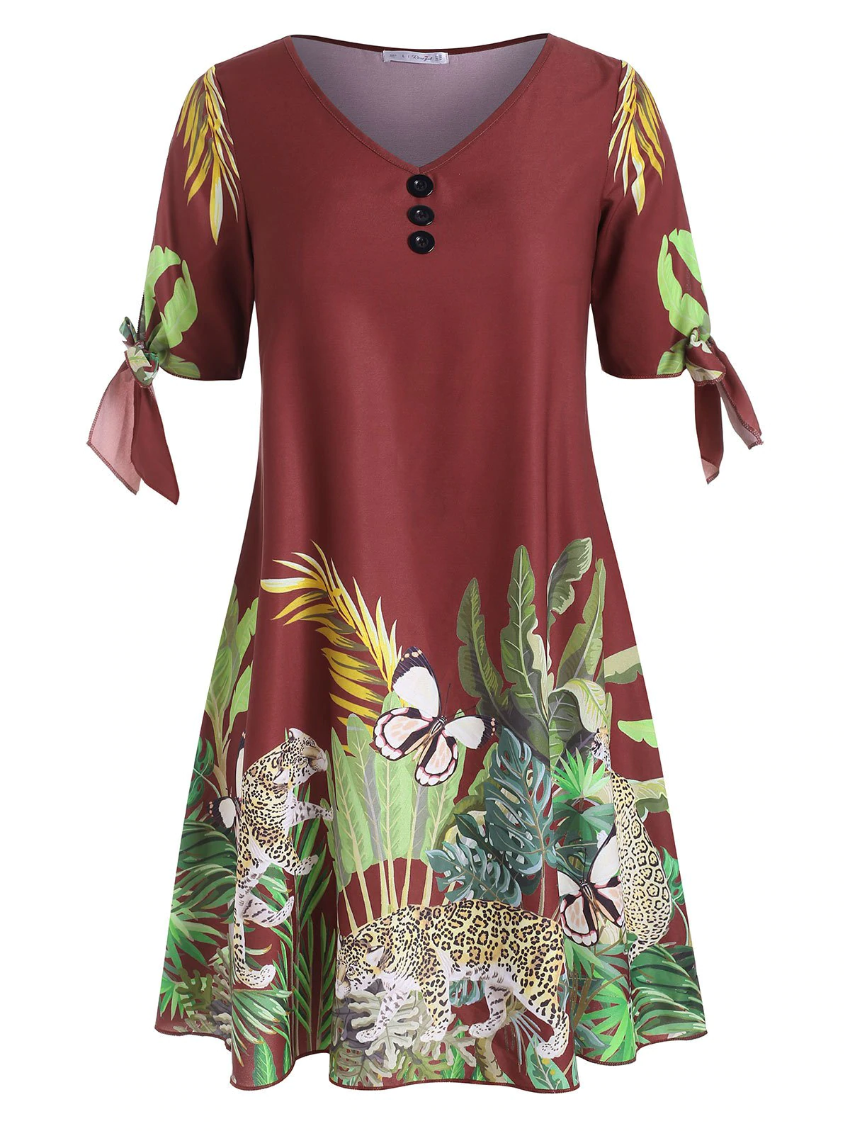 An eye-catching print mixed with the flattering butterfly print, our favorite leopard print, and the leaves print to bring a polished look, this plus size dress is a pretty style with the edgy tie-sleeve design and the decorative buttons at the front to add an edgy finish.