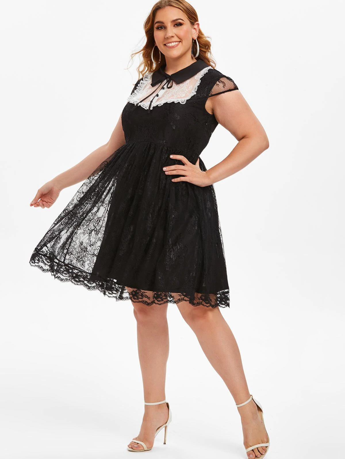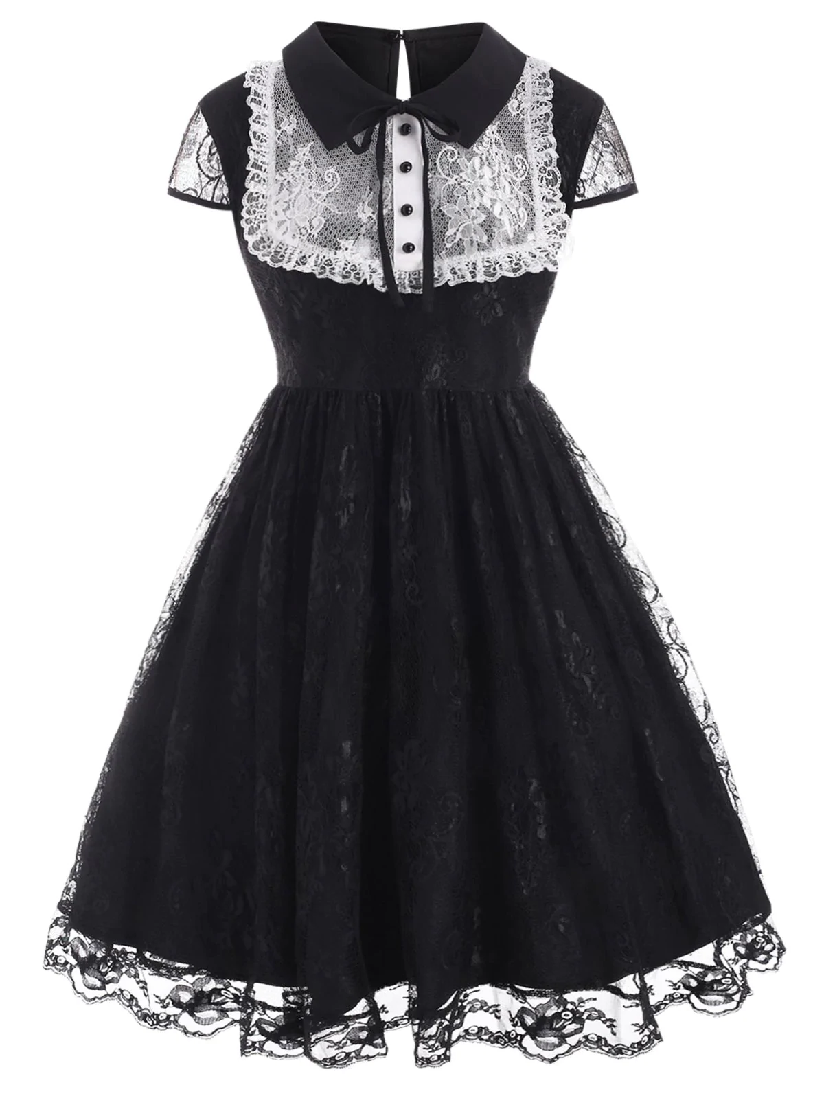 Cap Sleeve Tie Collar Mock Buttons Lace Plus Size Dress