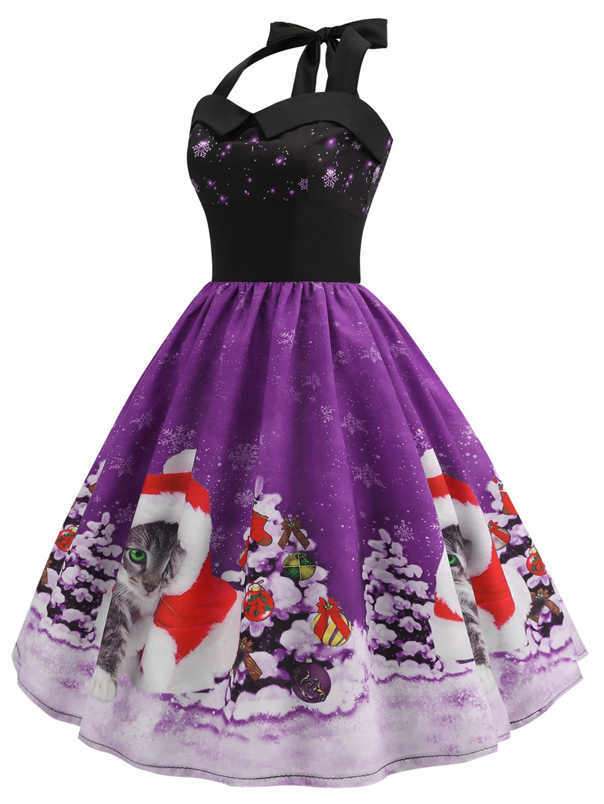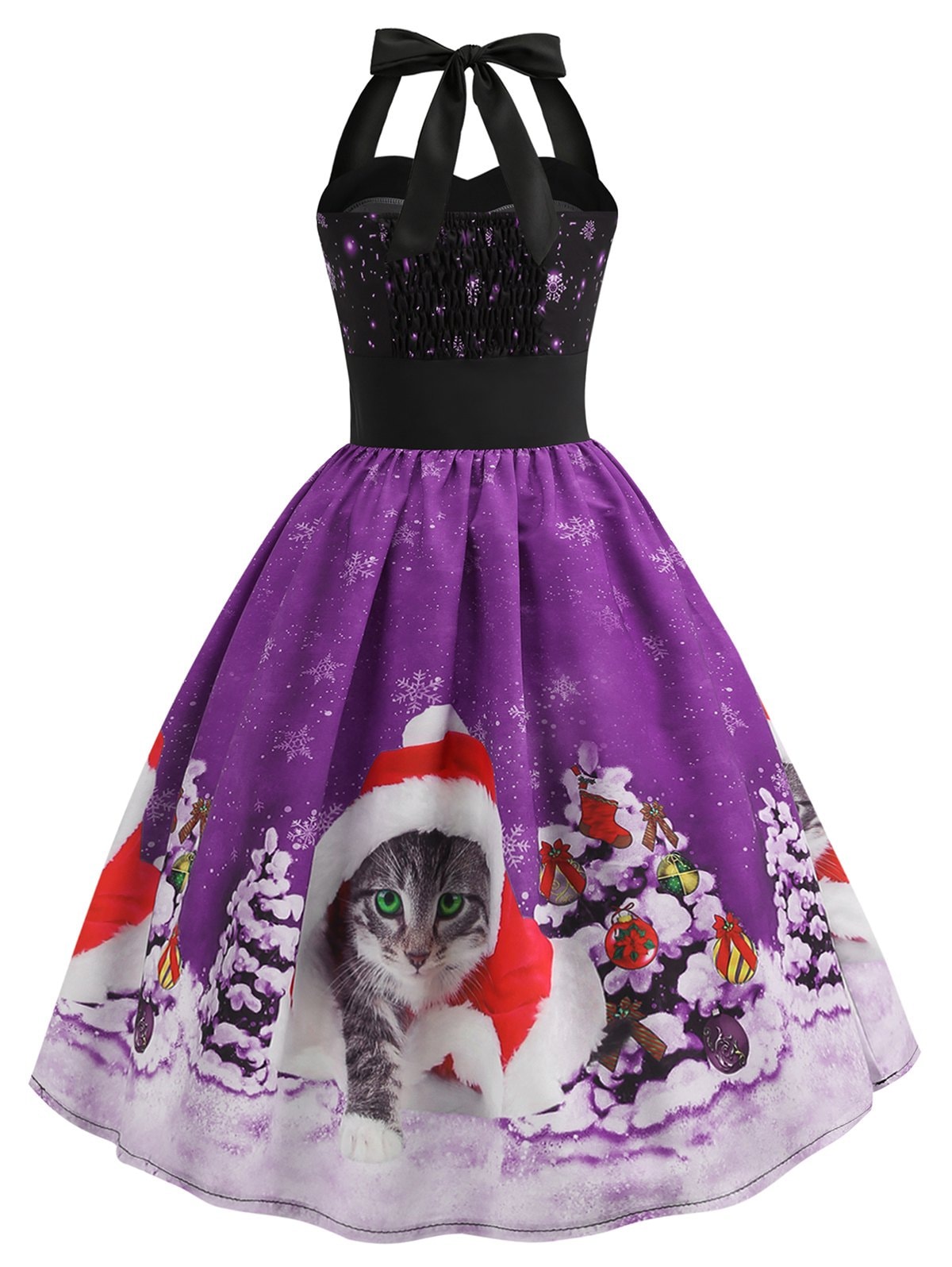 Christmas Tree Cat Snowflake Smocked Back Halter Plus Size Dress