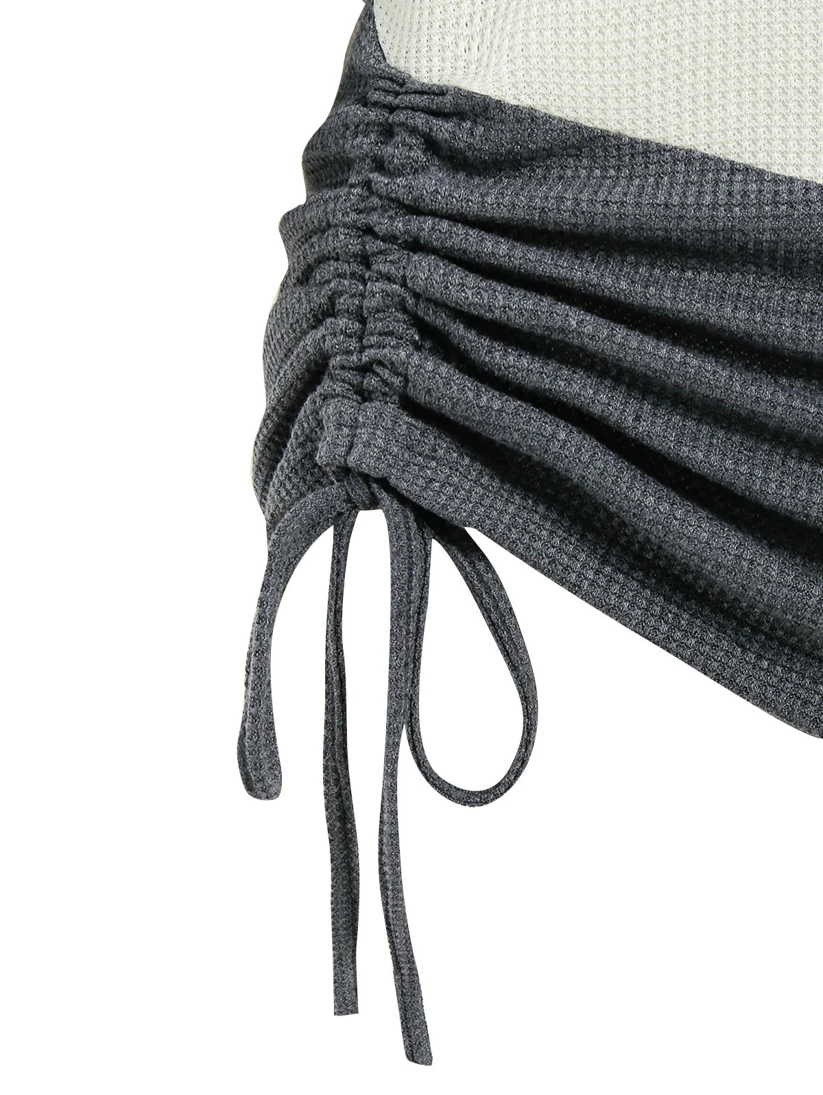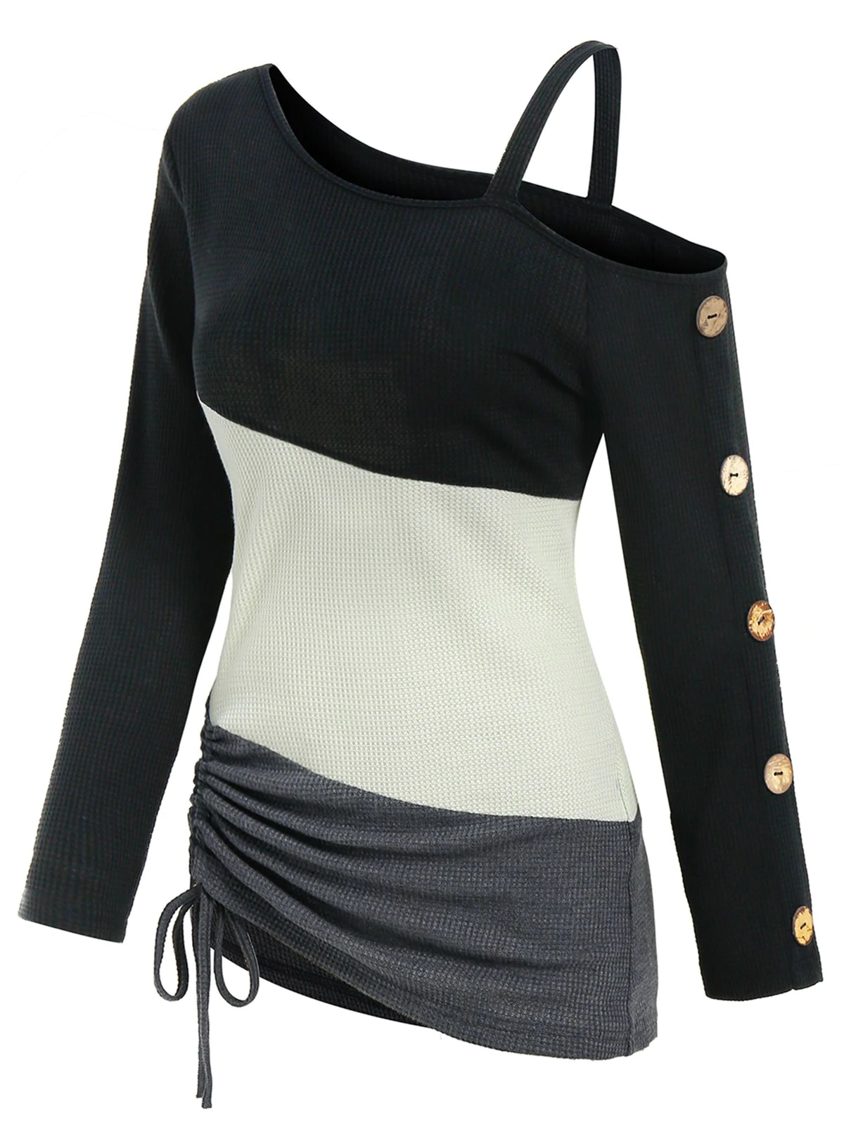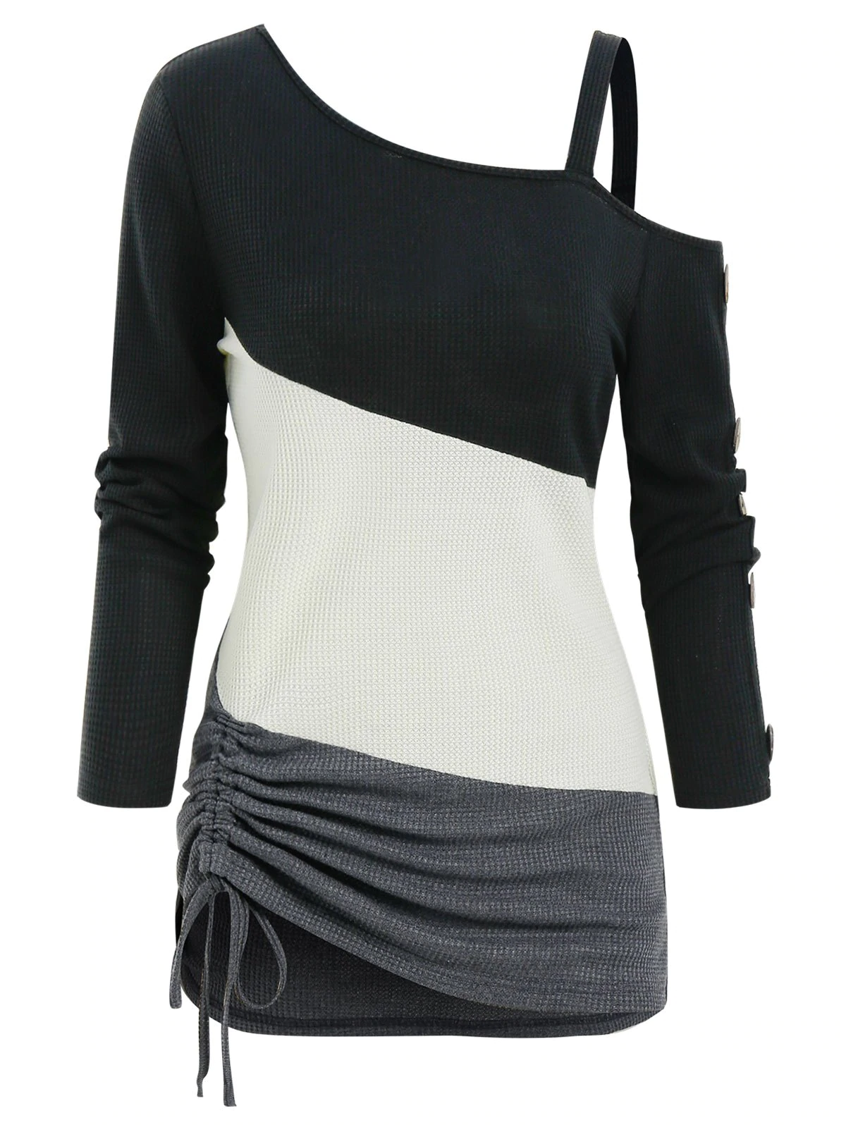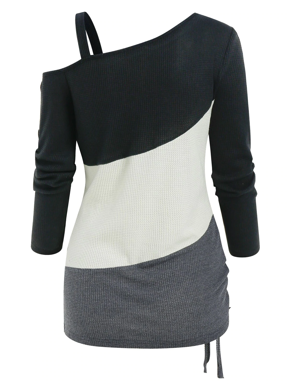 Colorblock Open Shoulder Mock Button Drawstring Hem T Shirt