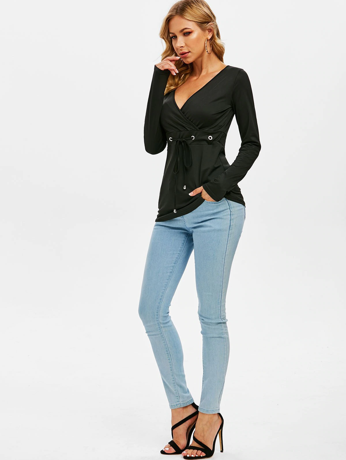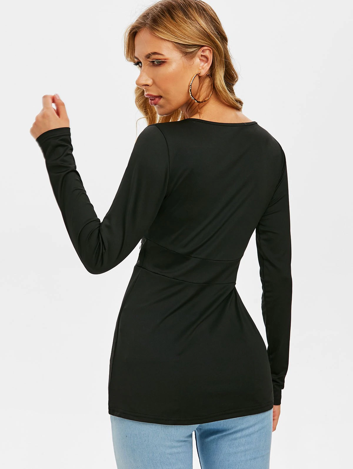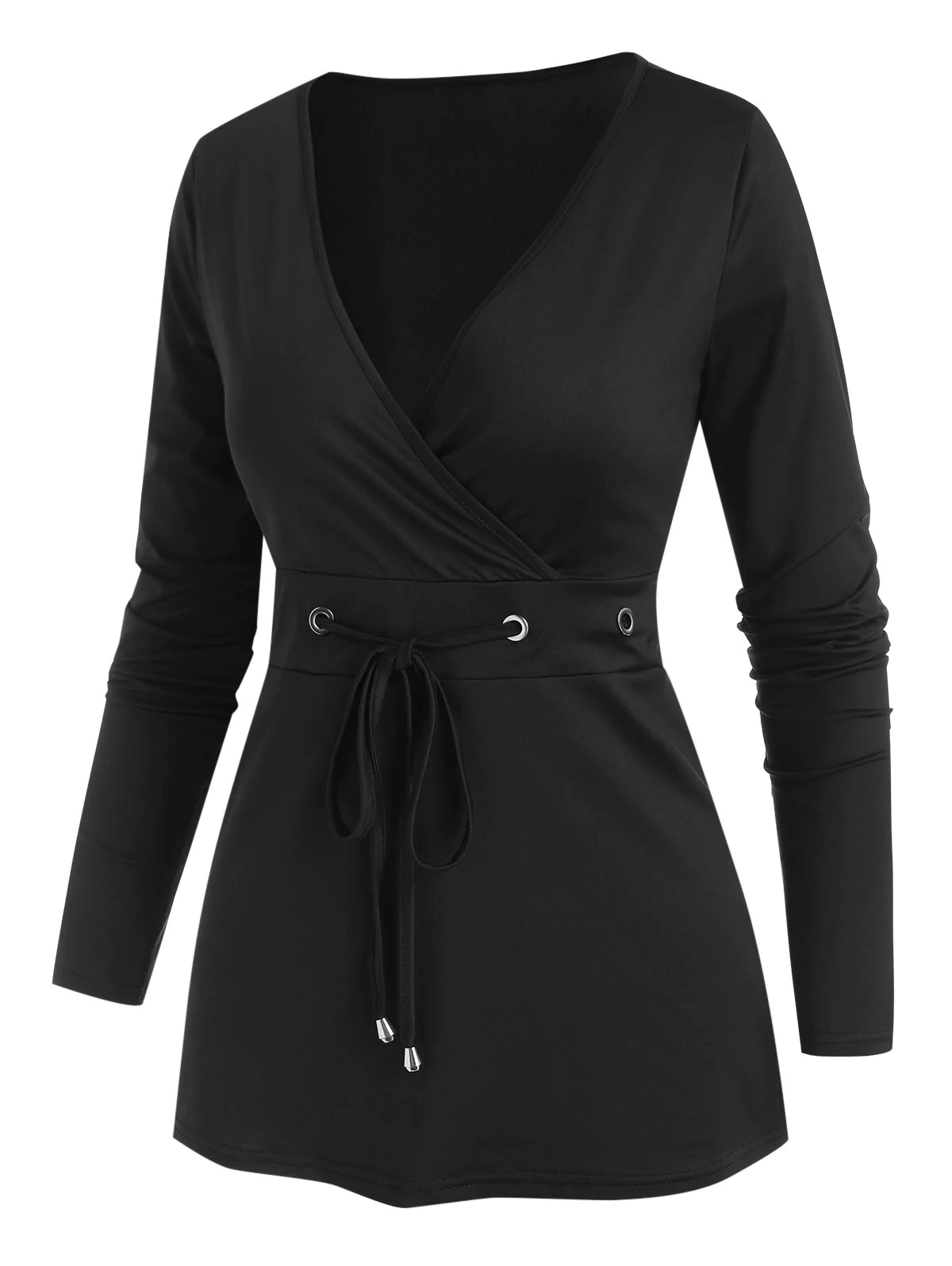 The long-sleeve tee adorns with an alluring plunging neckline to show off your bust area in the best possible way. The drawstring waist can be adjusted so as to flaunt your slim waist.