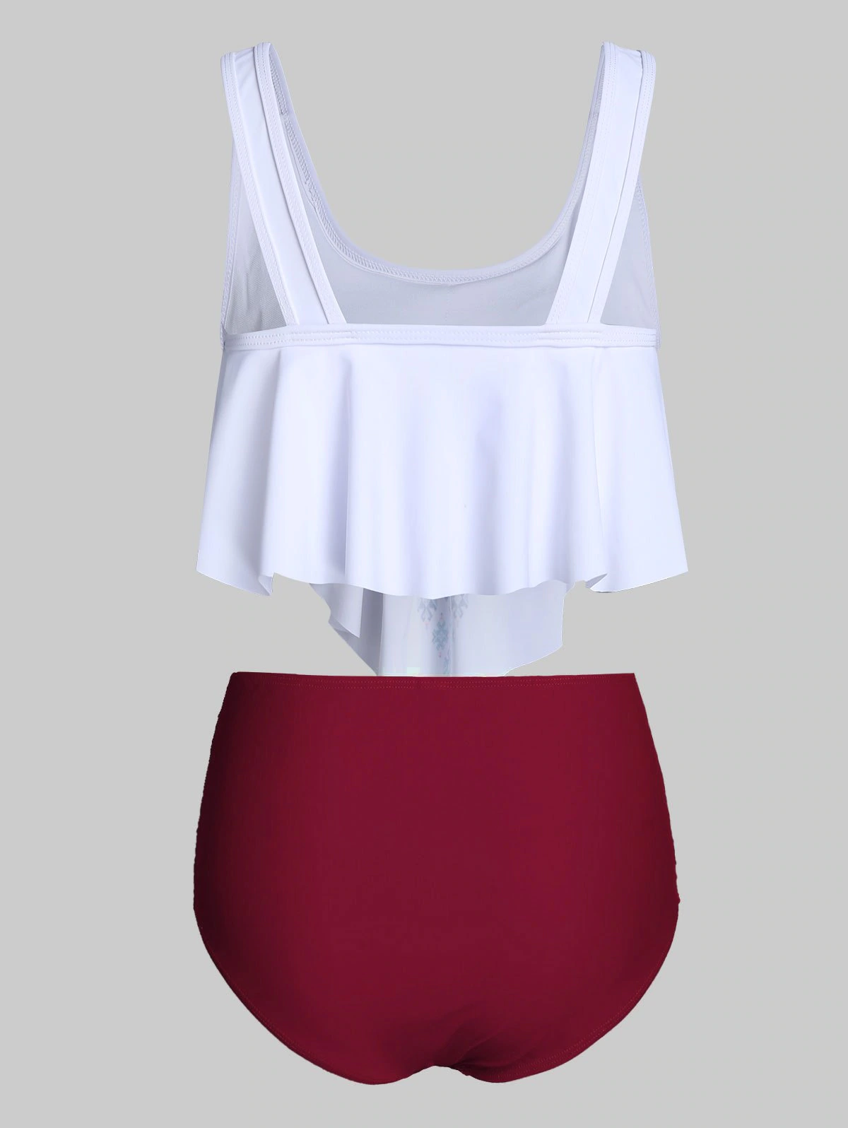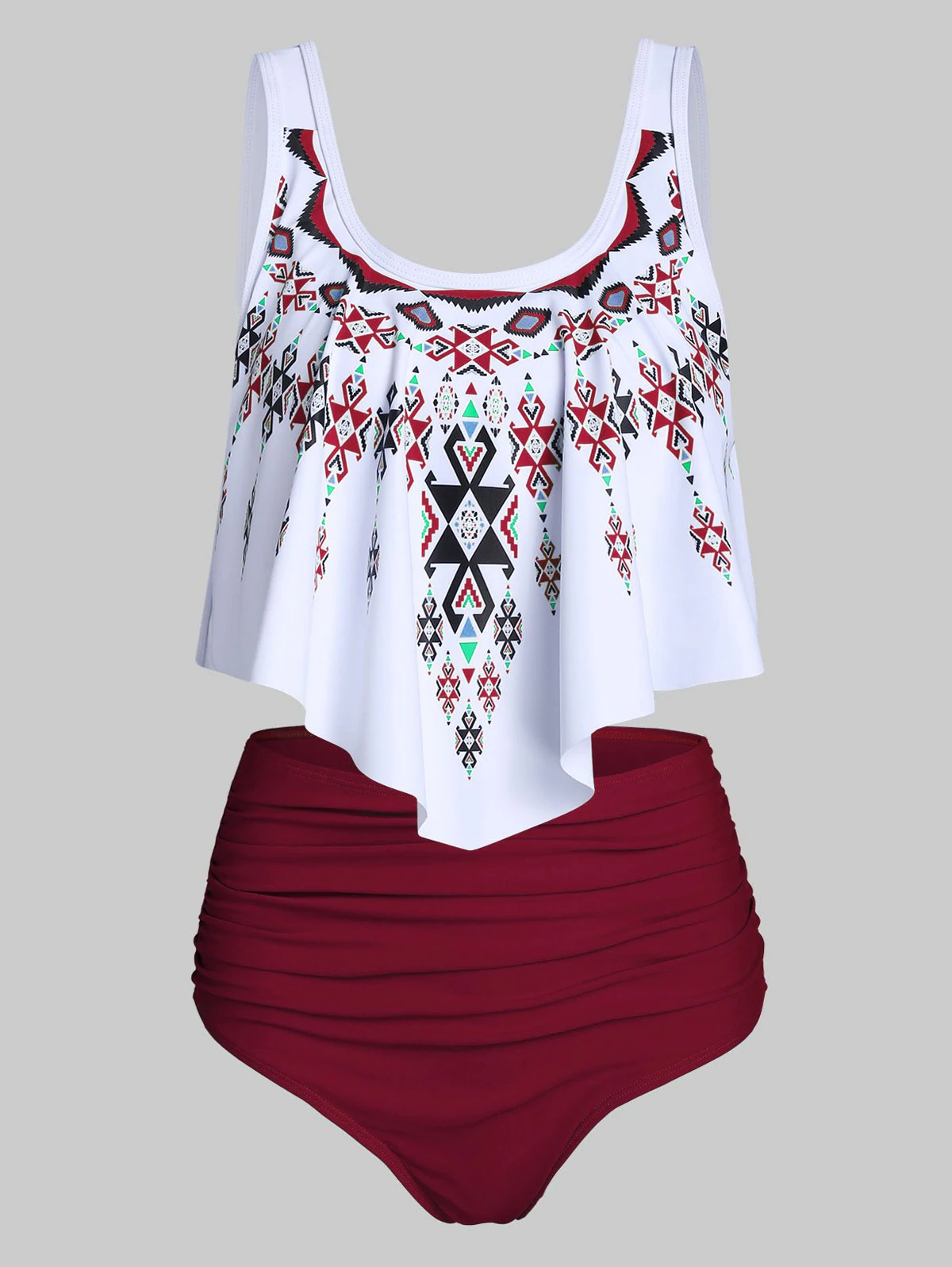 The geometric print tankini swimsuit offers both fashion and comfort. The bikini top features a ruffled overlay with padded cups for a perfect fit. Ruched matching bikini bottom is high-waisted for a flattering silhouette.