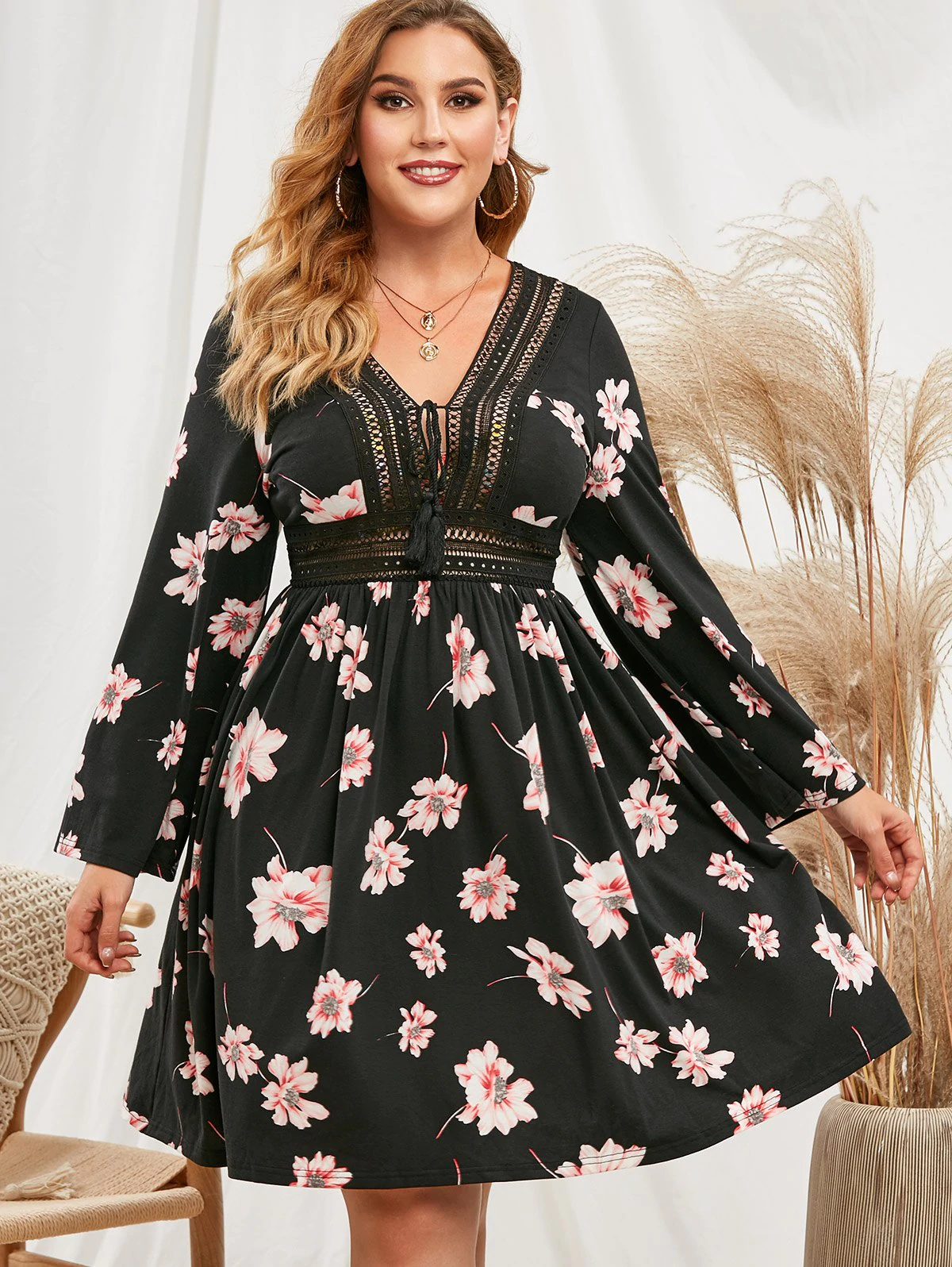 Floral Crochet Trim Tassels Tie Collar Plus Size Dress