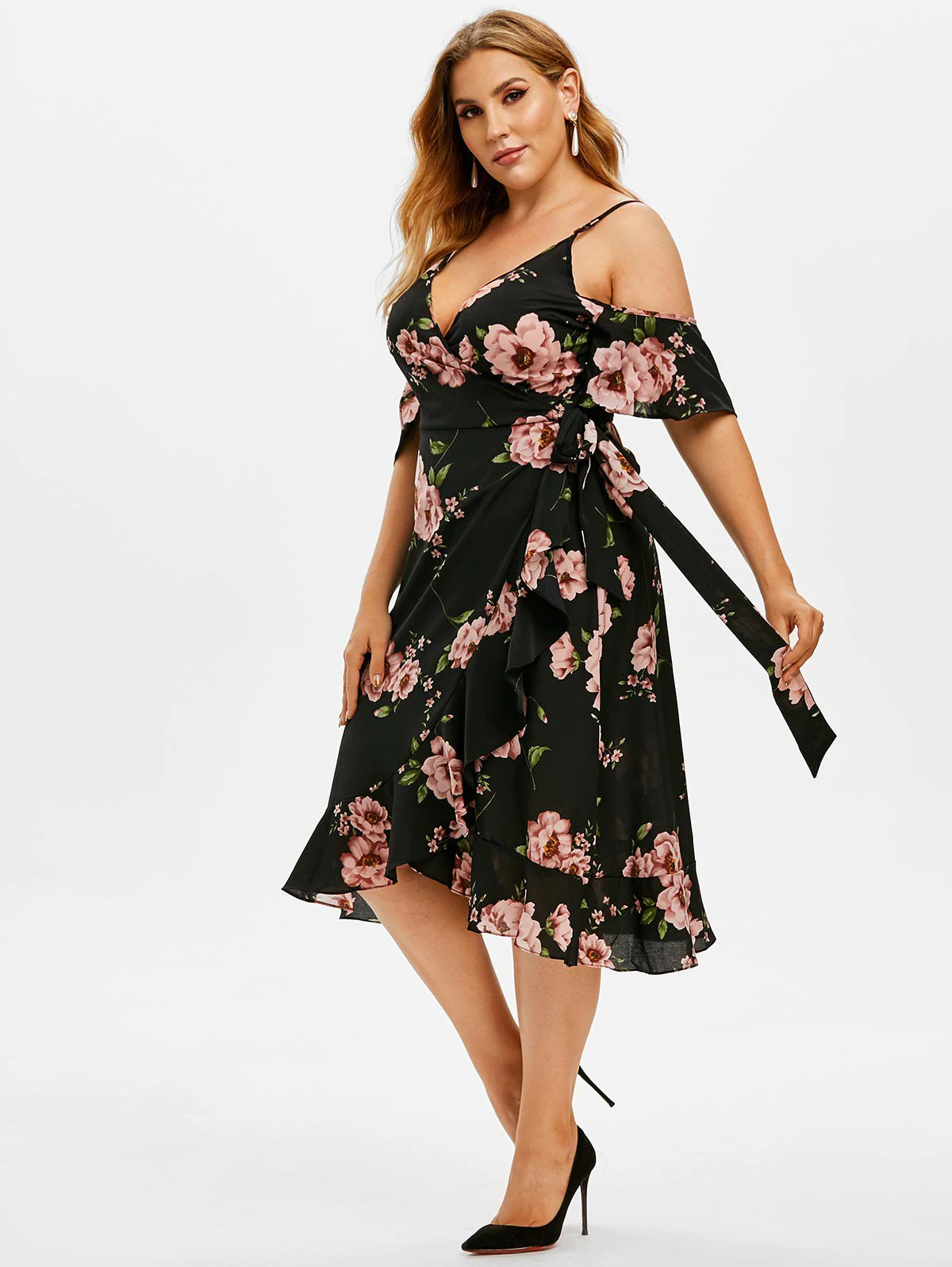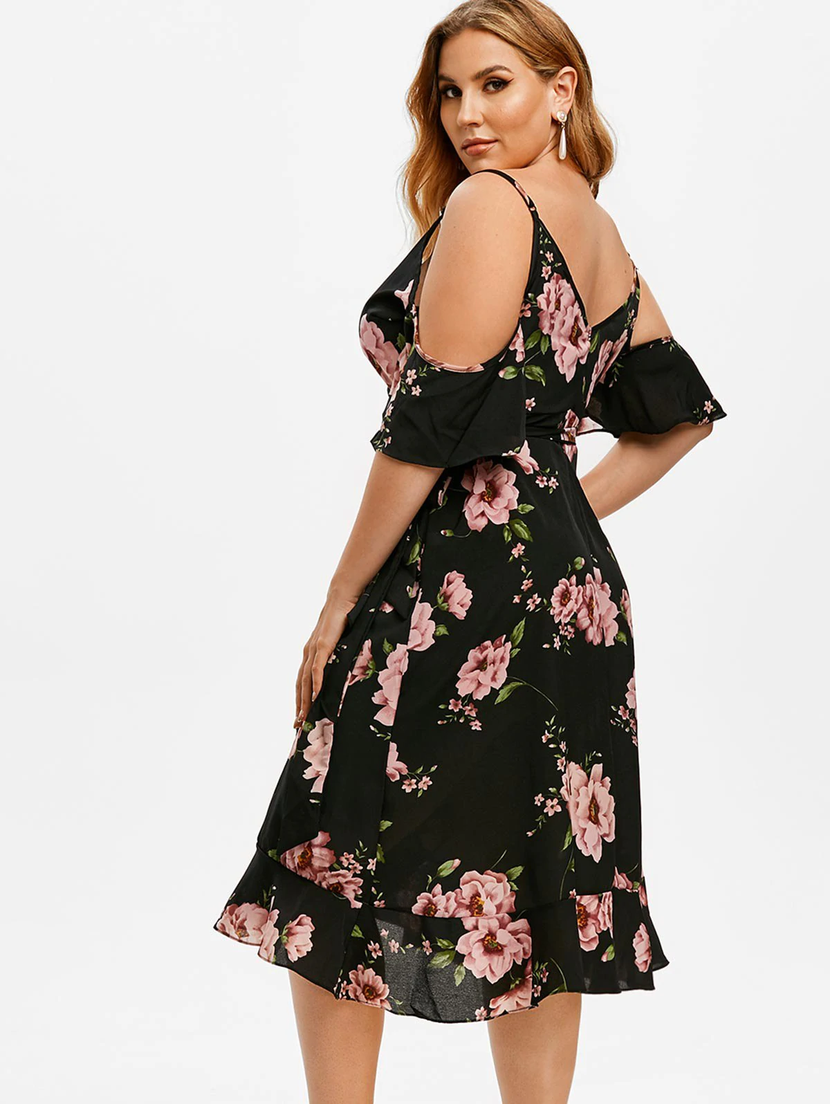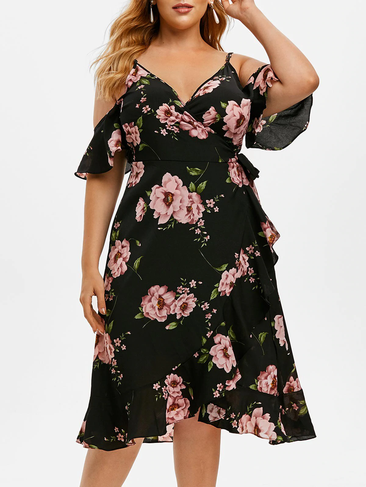 Floral Open Shoulder Flounces Plus Size Wrap Dress