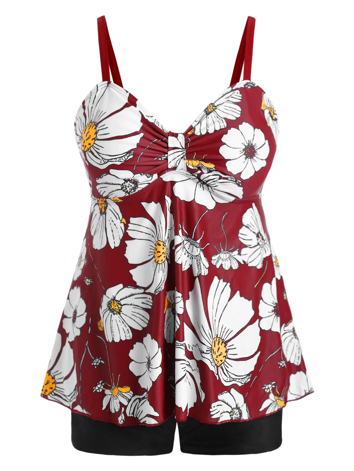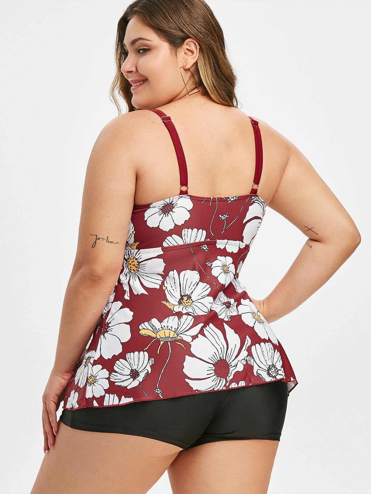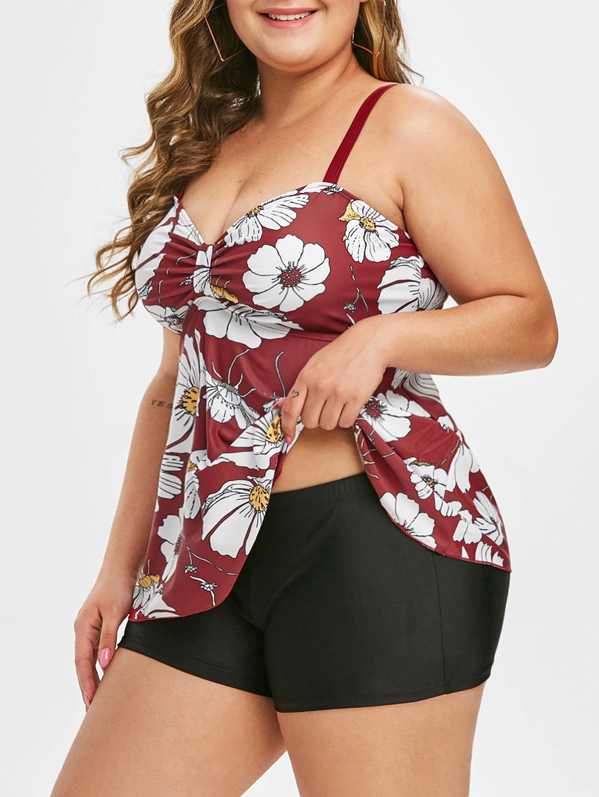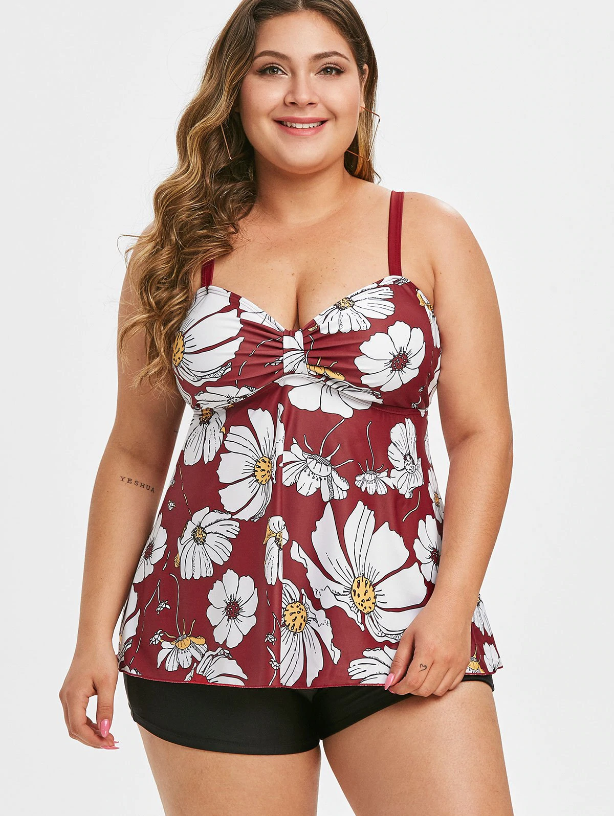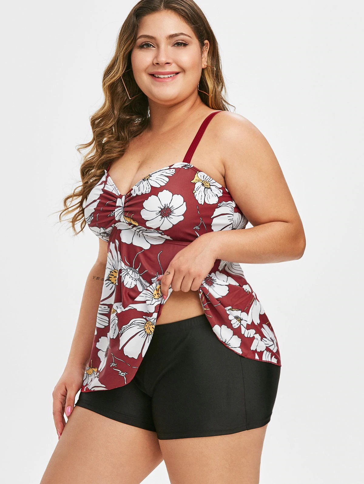 Floral Ruched Contrast Plus Size Tankini Swimsuit