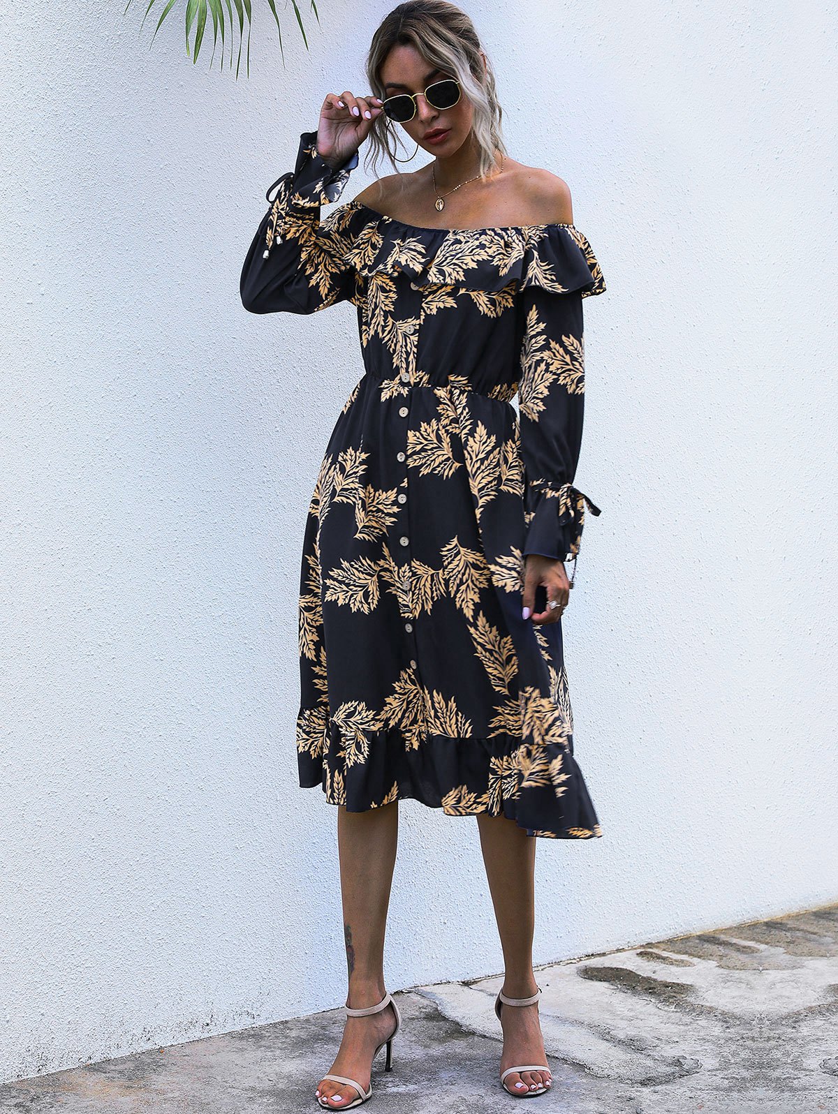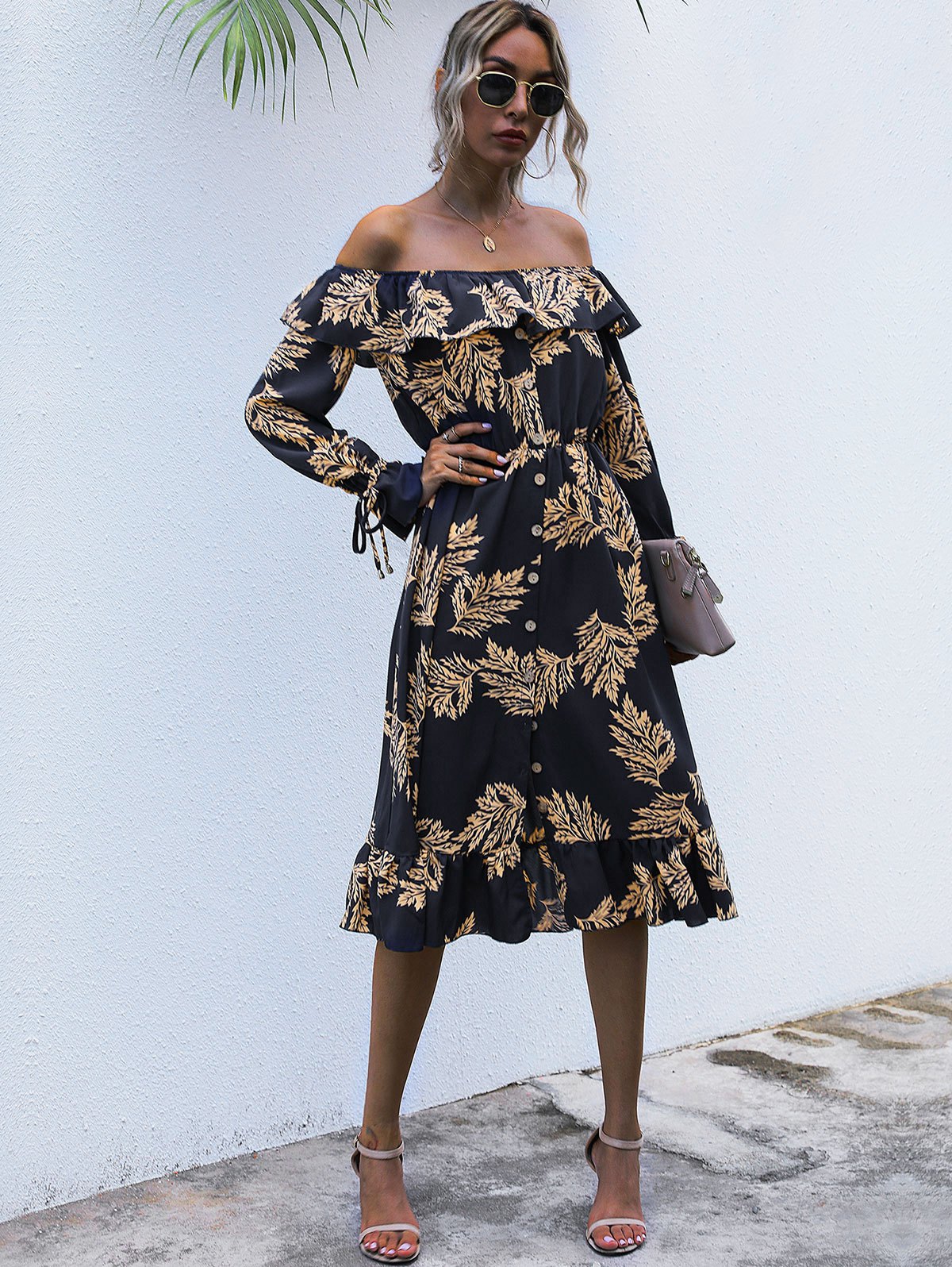 Flounce Off Shoulder Leaf Print Poet Sleeve Dress