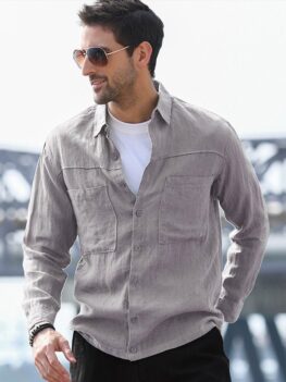 This piece shirt feels dashing with its gilding print design, a basic collar and interior plaid trim, button-down front, long sleeves with buttoned cuffs, and a curved hem.
