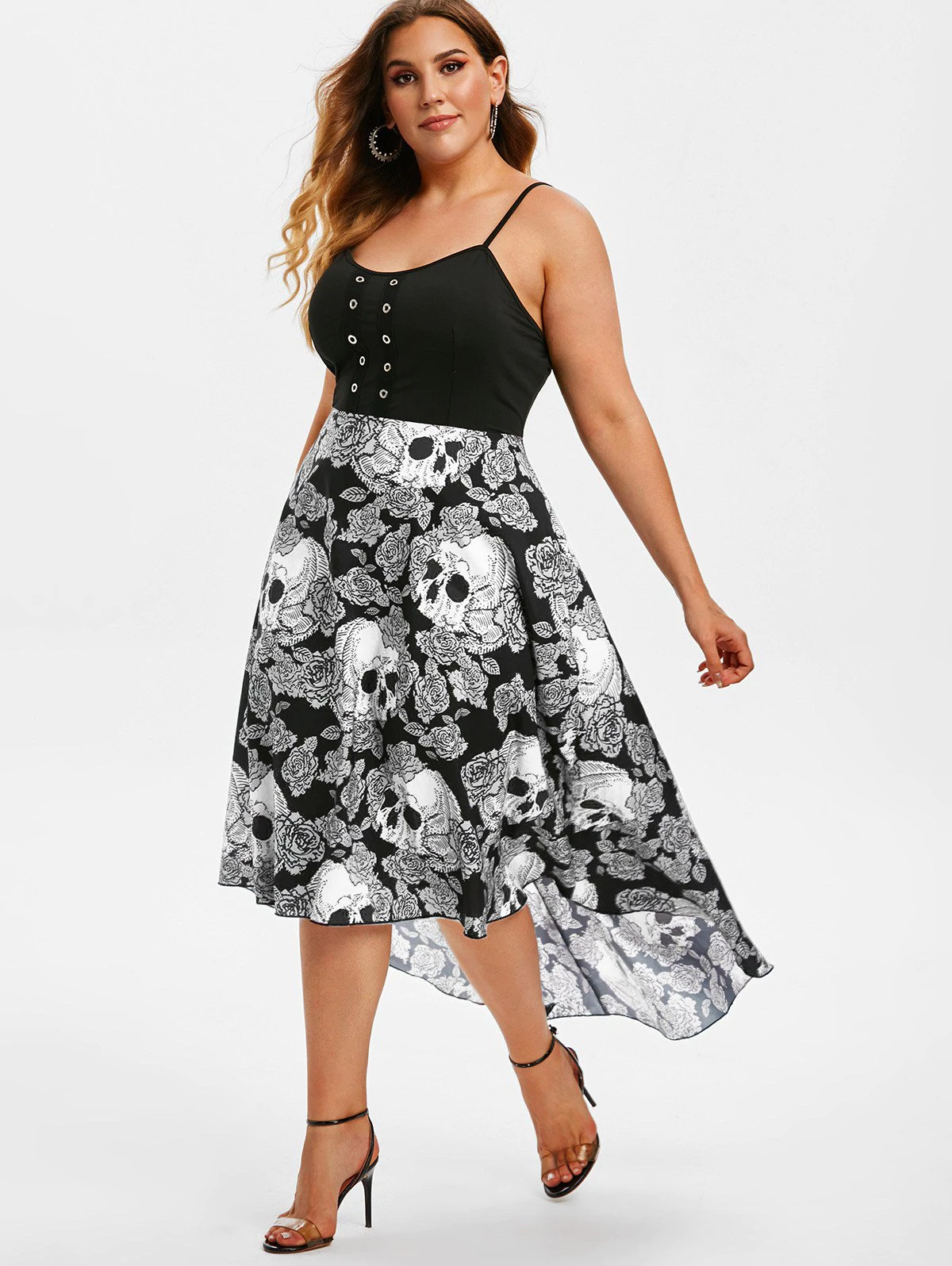 Grommet Floral Skull High Low Halloween Plus Size Dress
