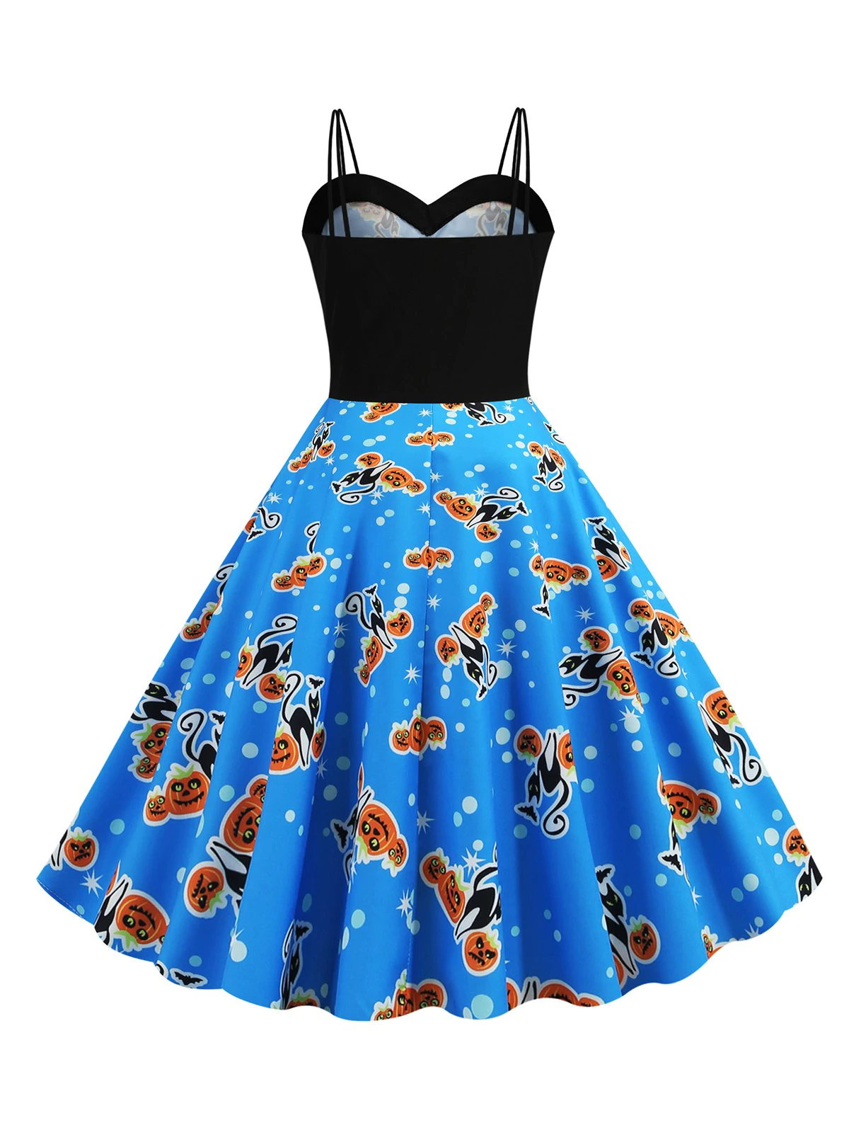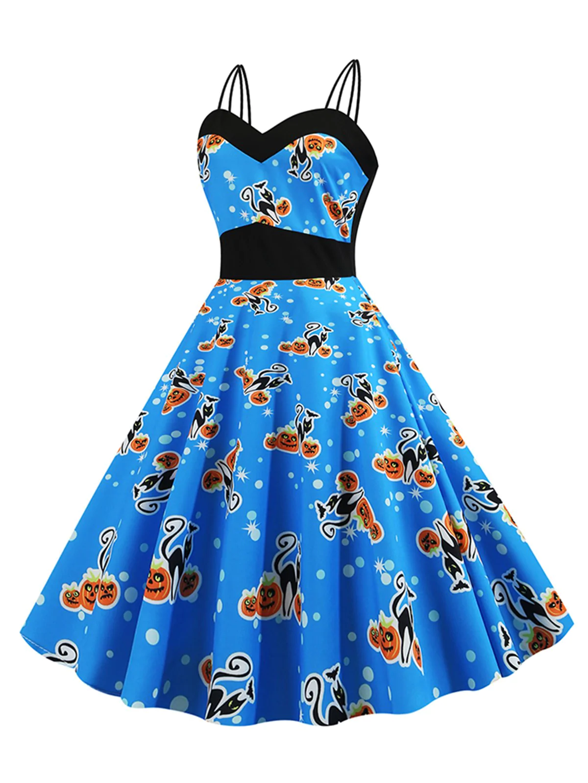 Halloween Dual Strap Cat Pumpkin Print Dress