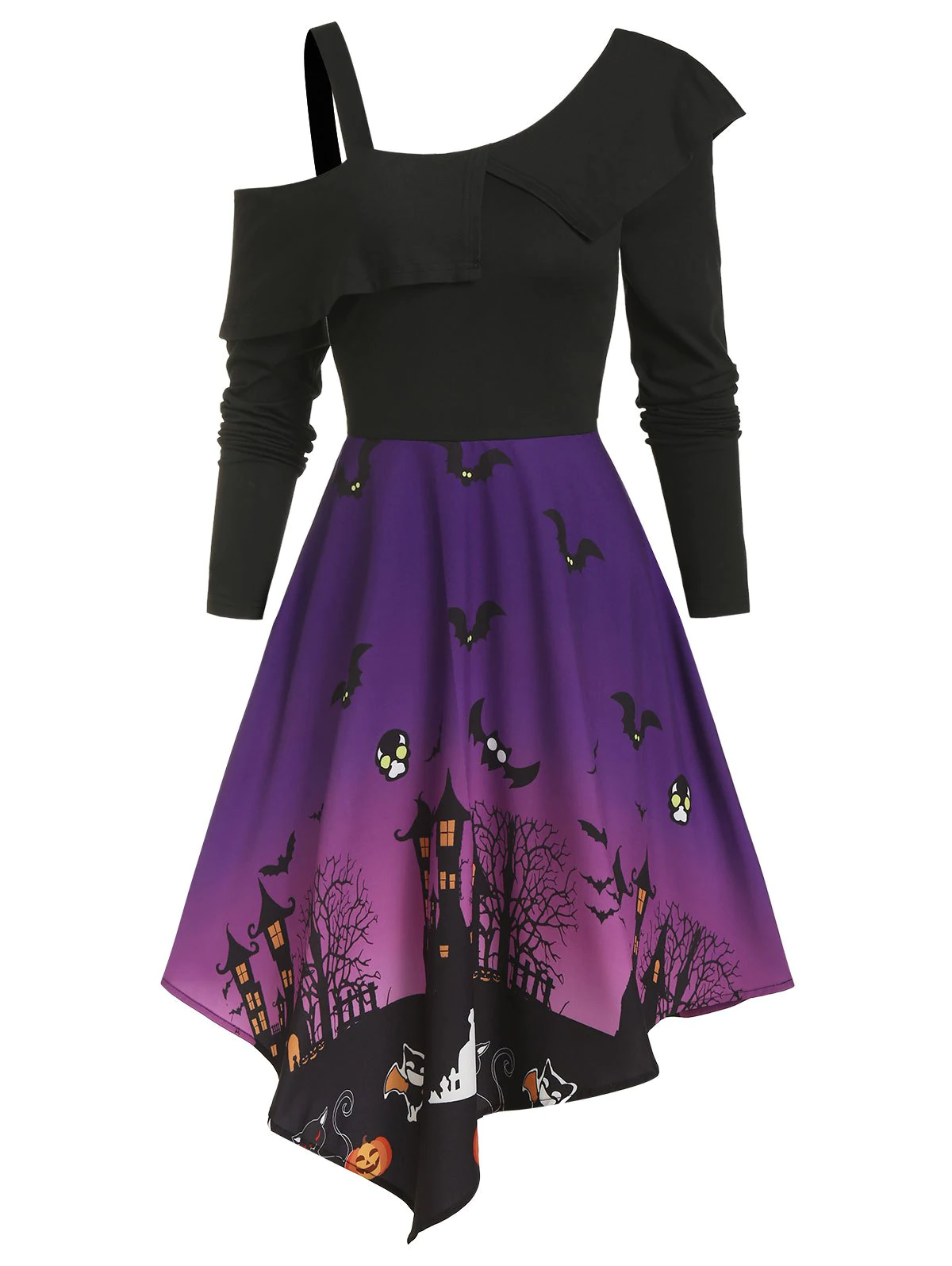 Halloween Night Bat Pattern High Waist Asymmetrical Dress