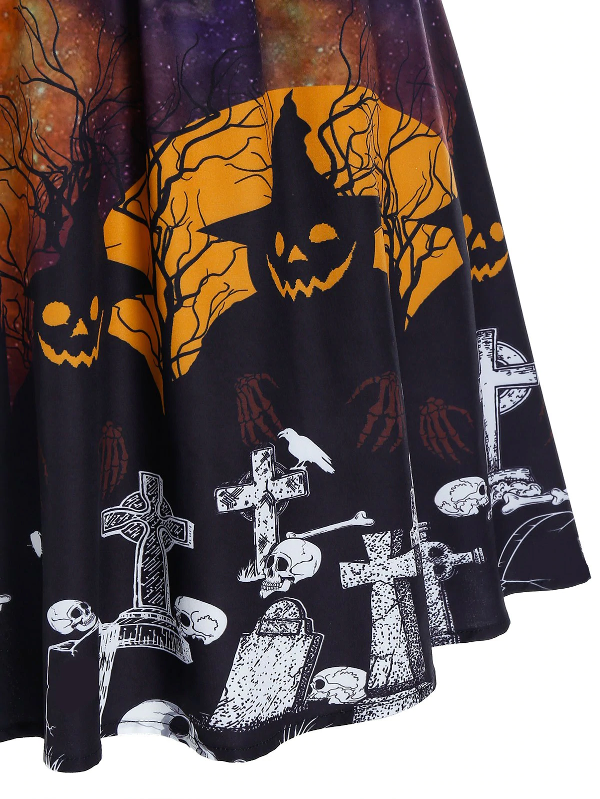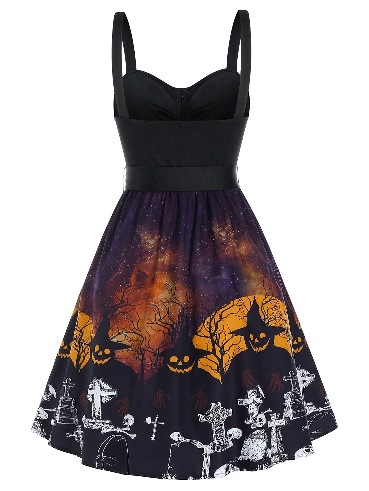 Halloween Pumpkin Skull Print Mock Button Belted Cami Dress