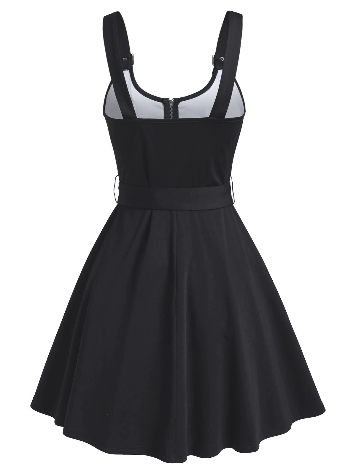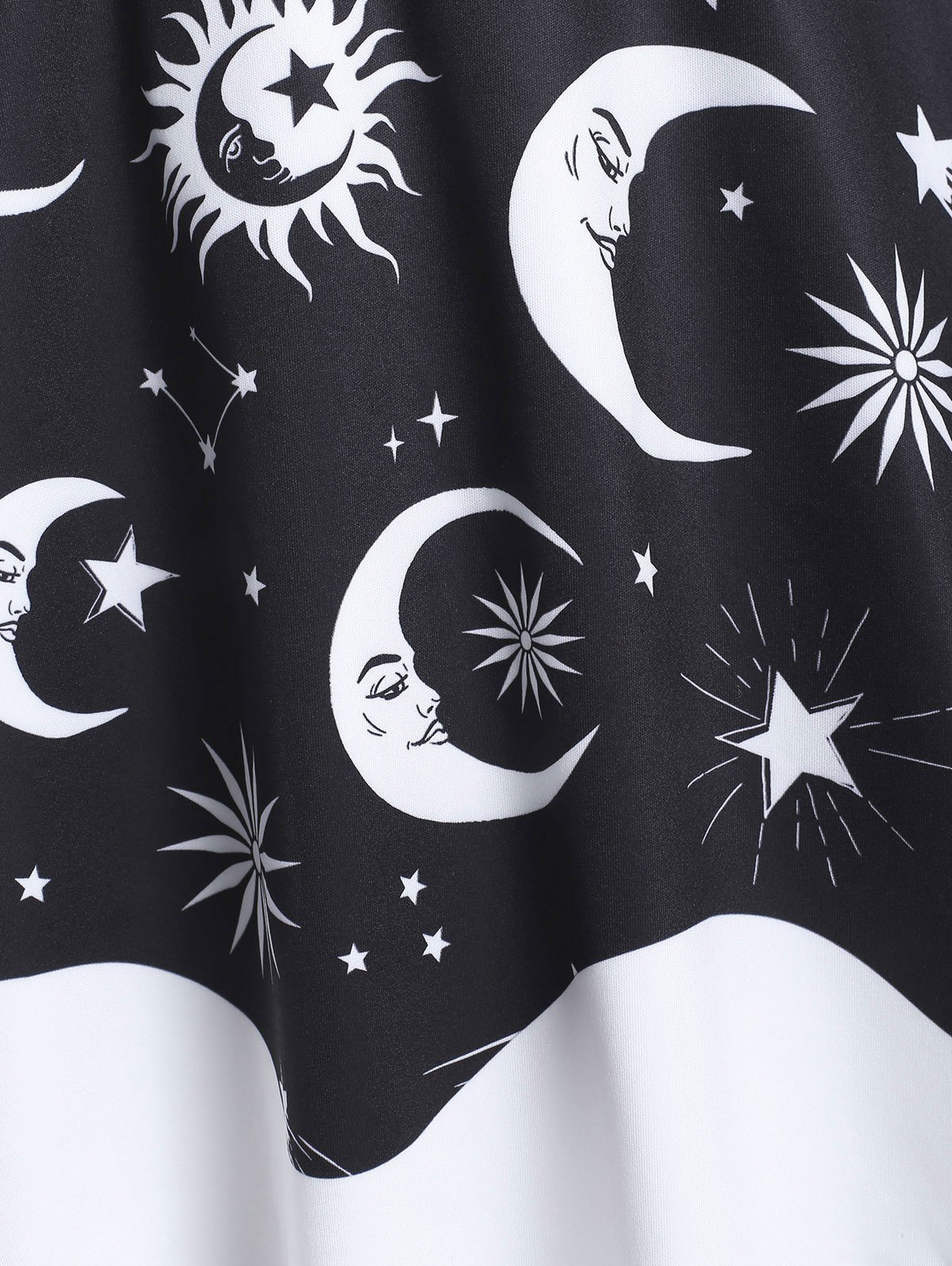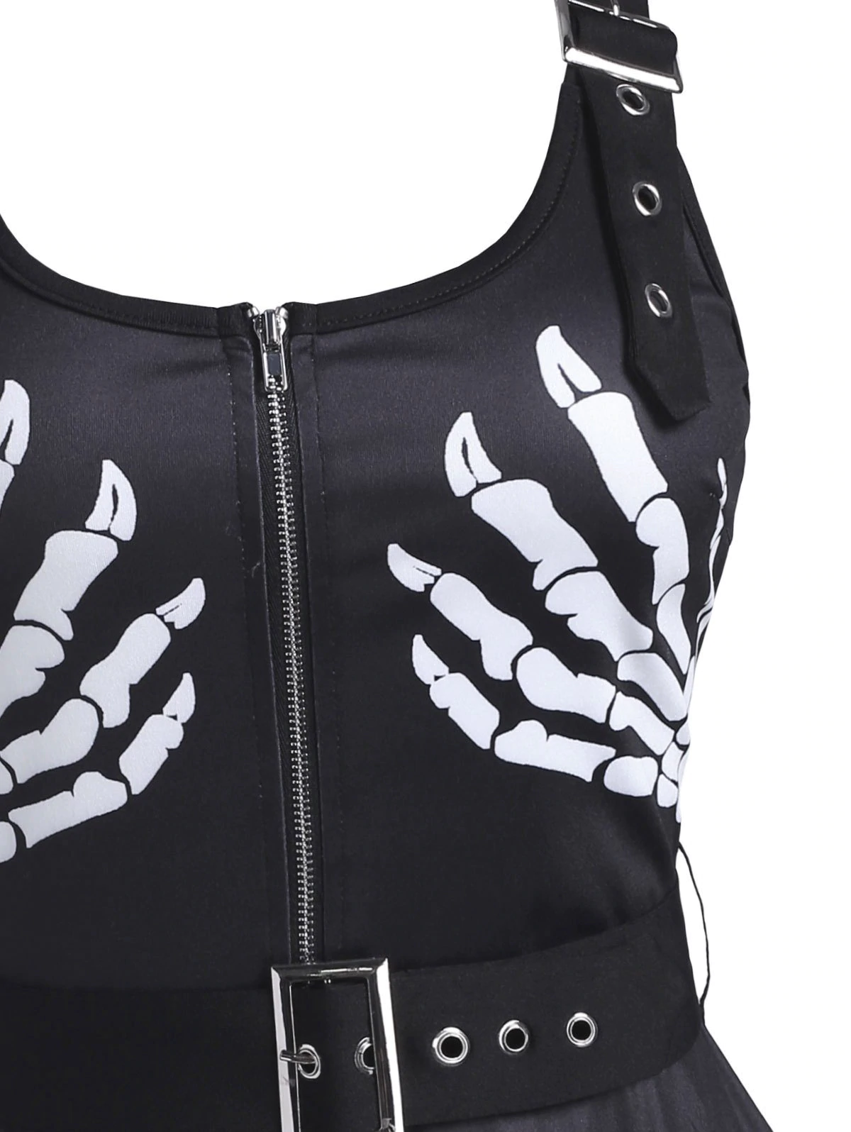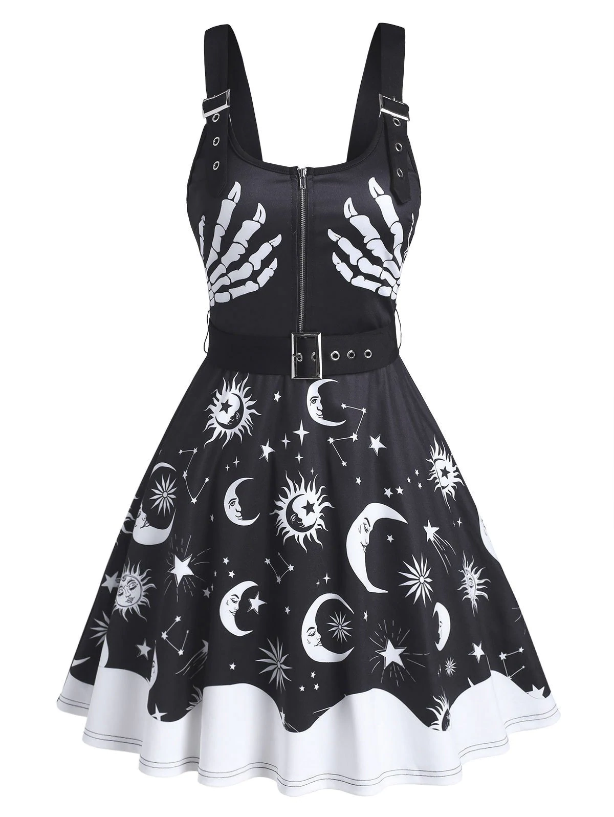 Halloween Skeleton Sun Moon Star Print Sleeveless Belted Dress