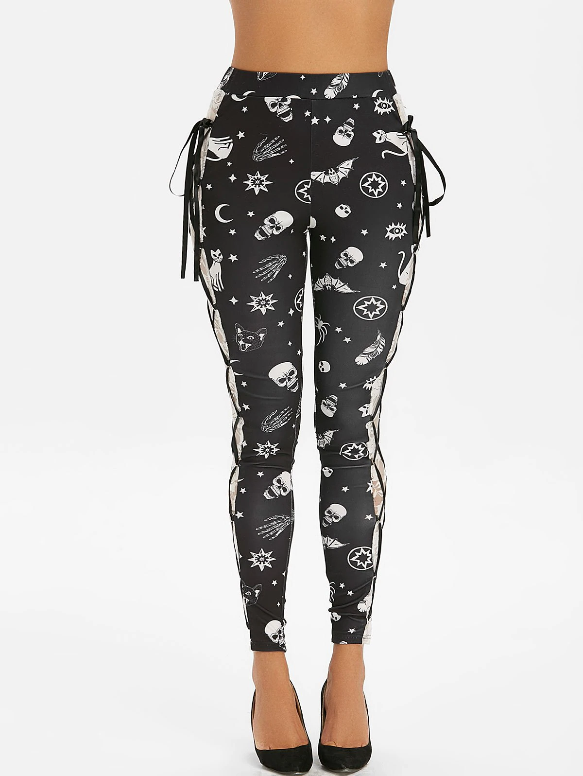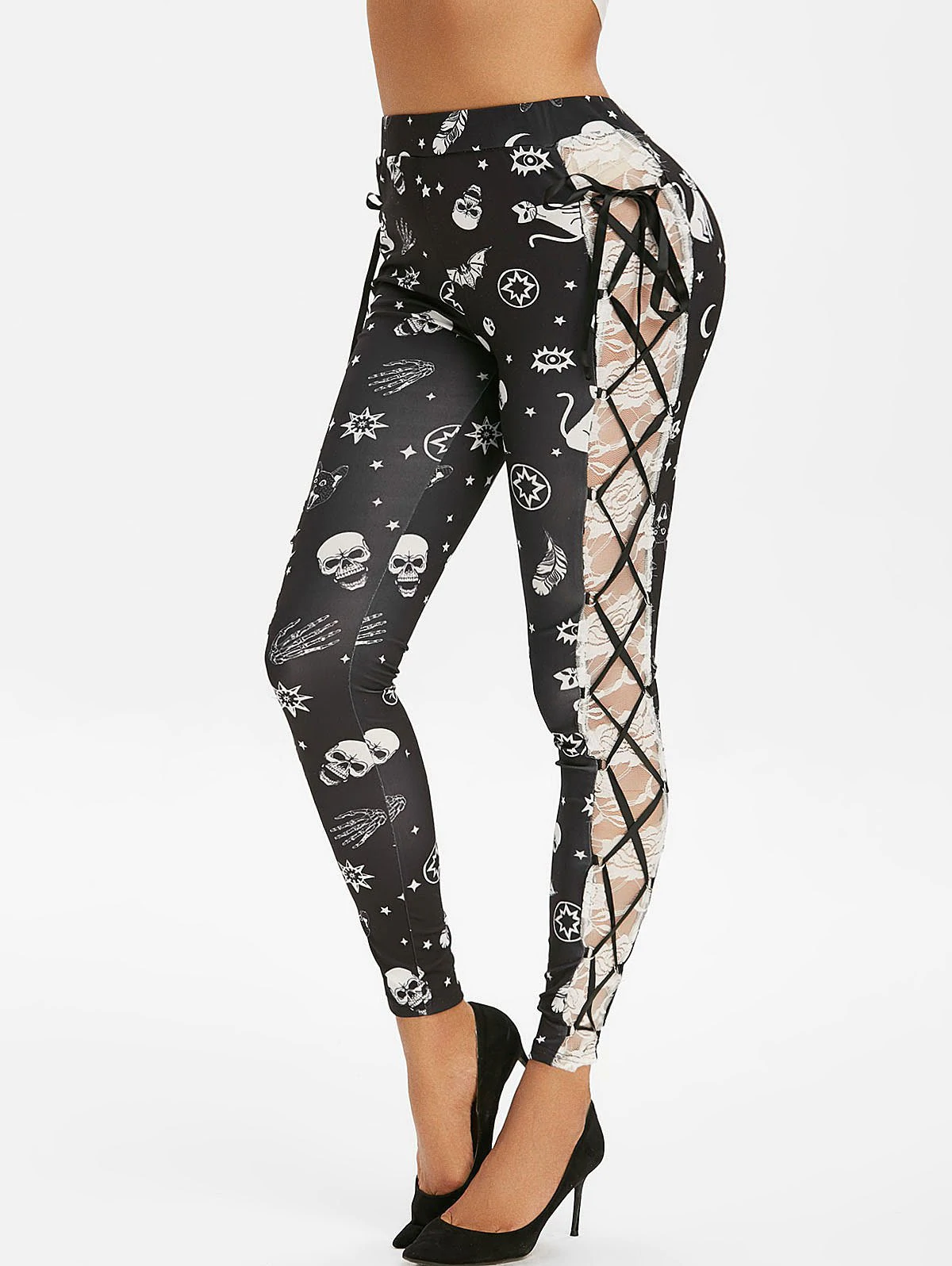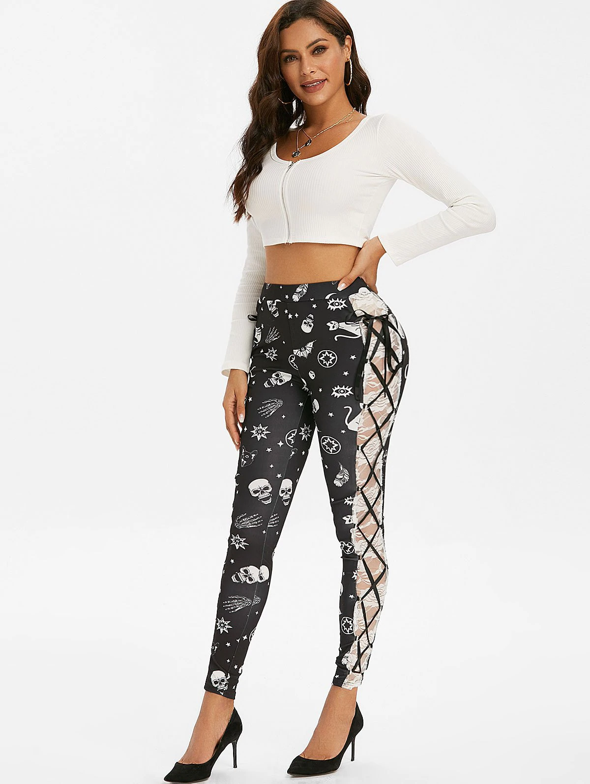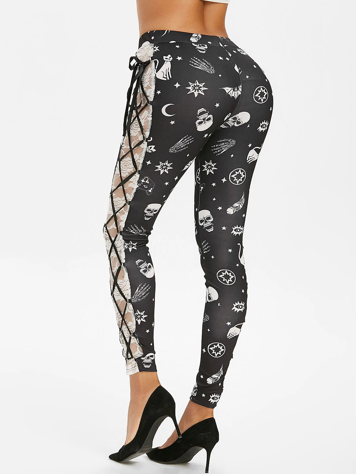 Halloween Skull Bat Cat Print Lace-up Lace Insert Skinny Pants