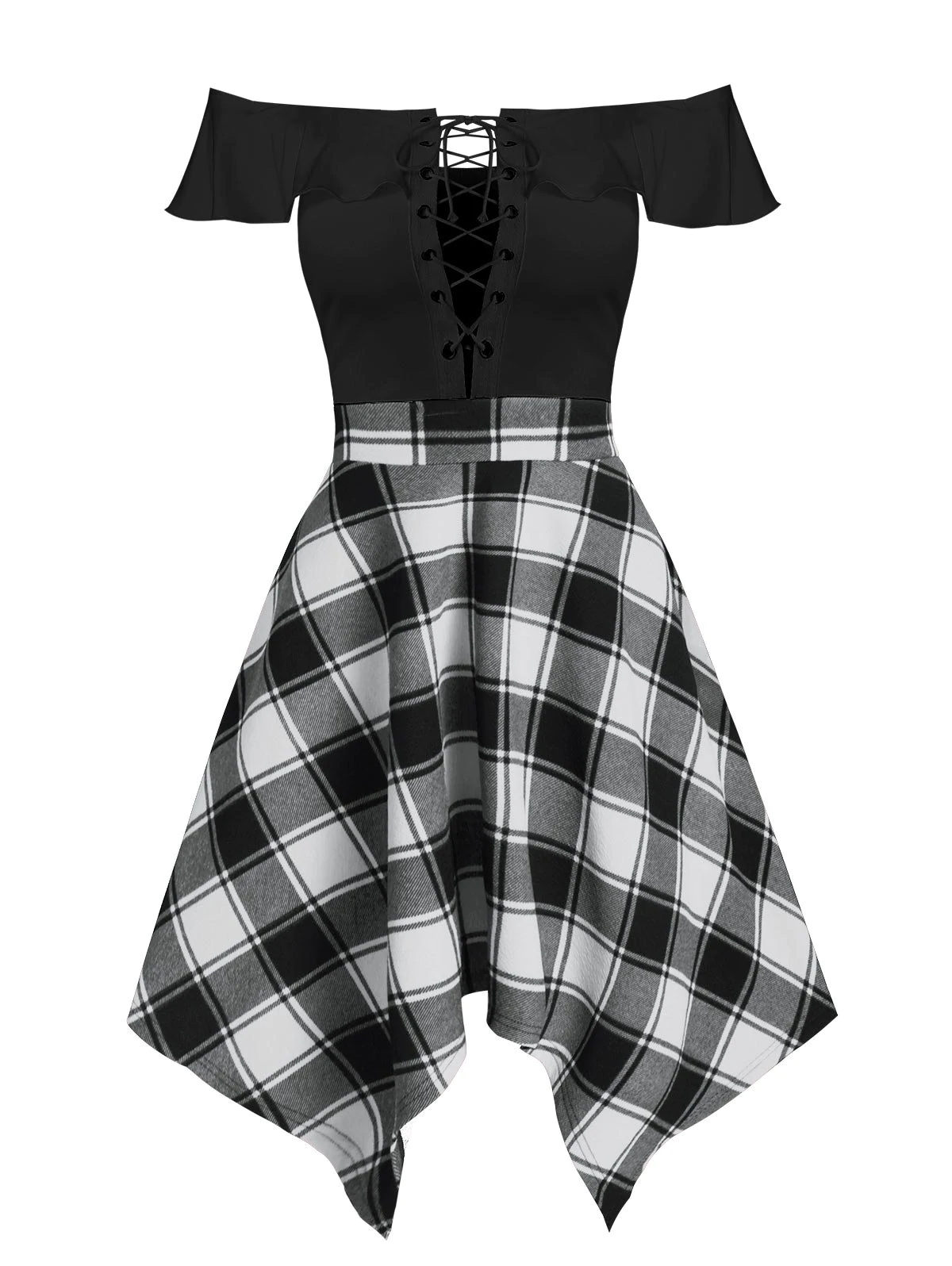 Handkerchief Off Shoulder Lace Up Plaid Dress